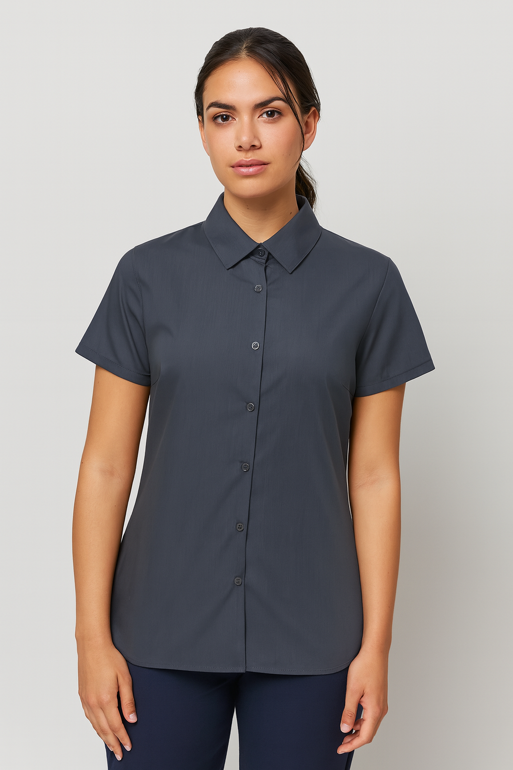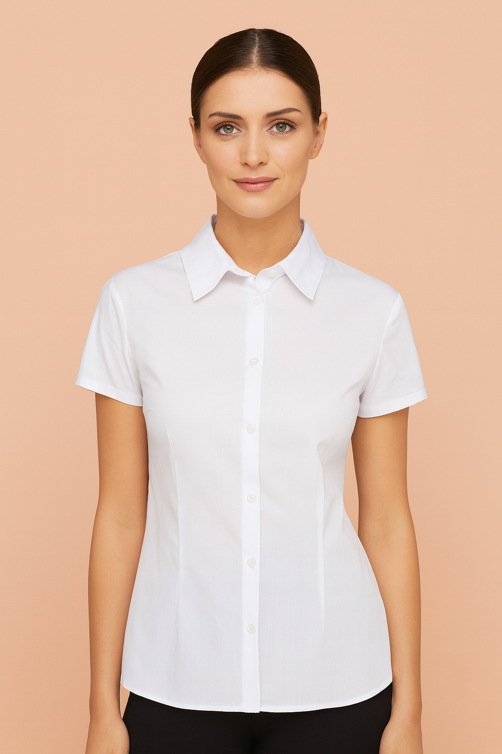 Camisa de trabajo para mujer de manga corta ligeramente entallada. Camisa laboral para mujer de tela Popelín que destaca por su resistencia y tacto sedoso (es un tejido menos grueso que el OXFORD). Disponible en 6 colores y desde la talla S hasta la 3XL. Apta para todas las estaciones del año.