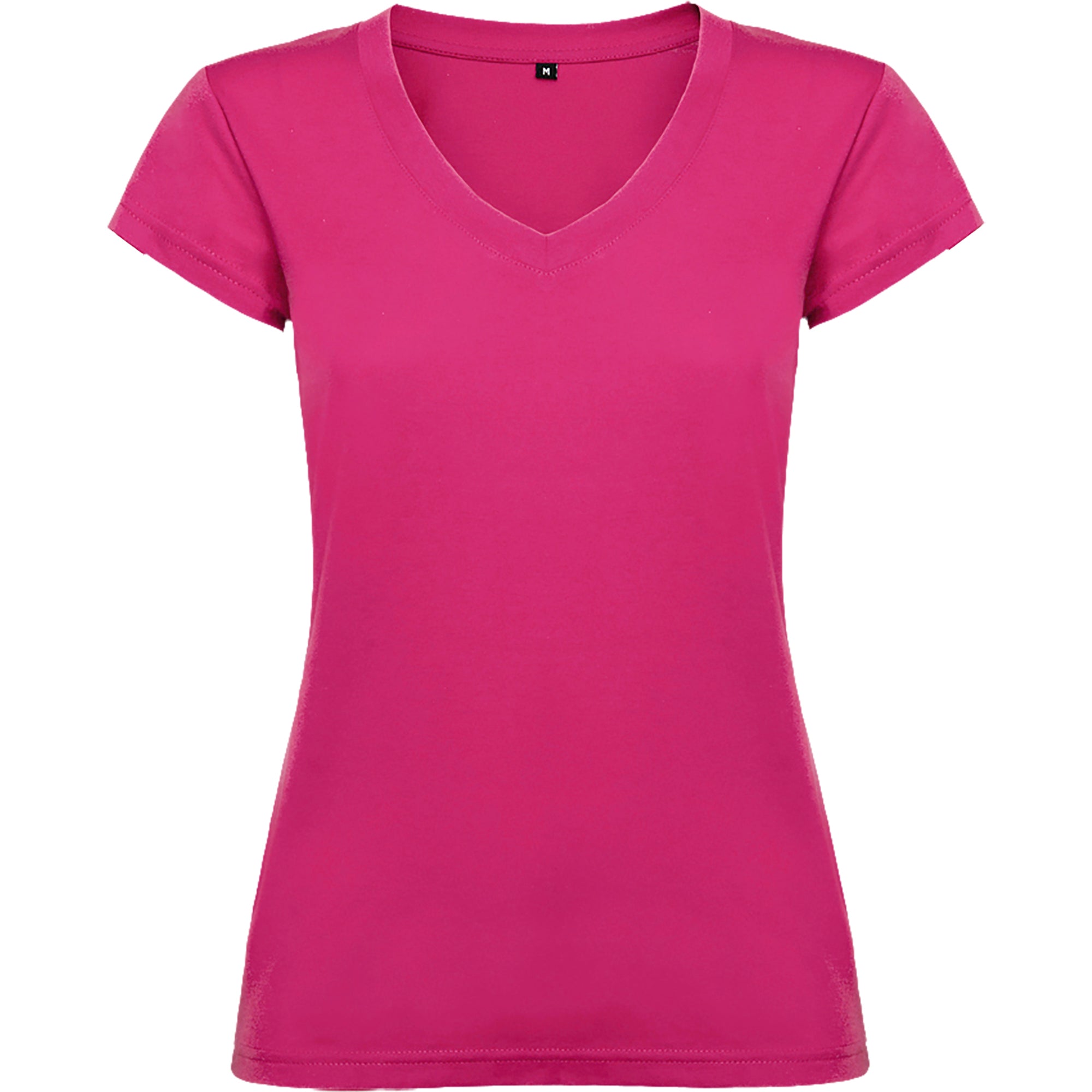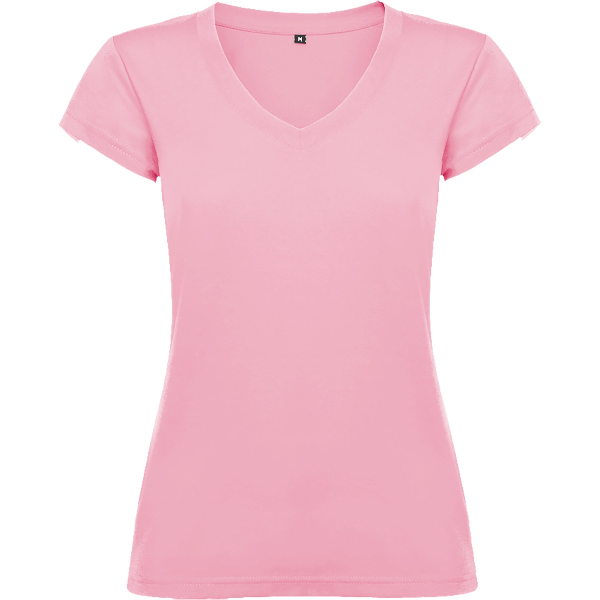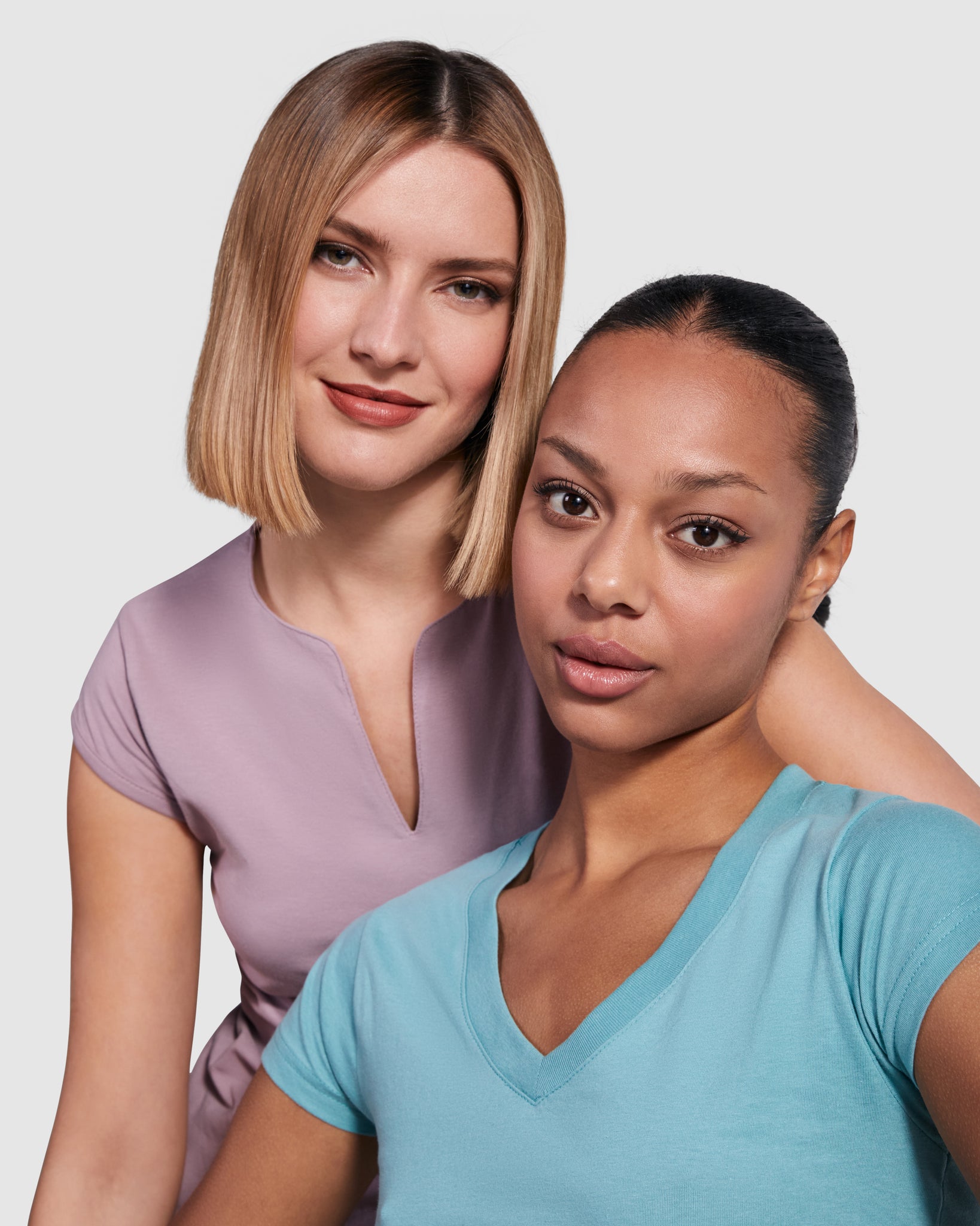 Camiseta de mujer con manga corta, escote en cuello de pico y acabados en ribete acanalado. Corte entallado con costuras laterales.
