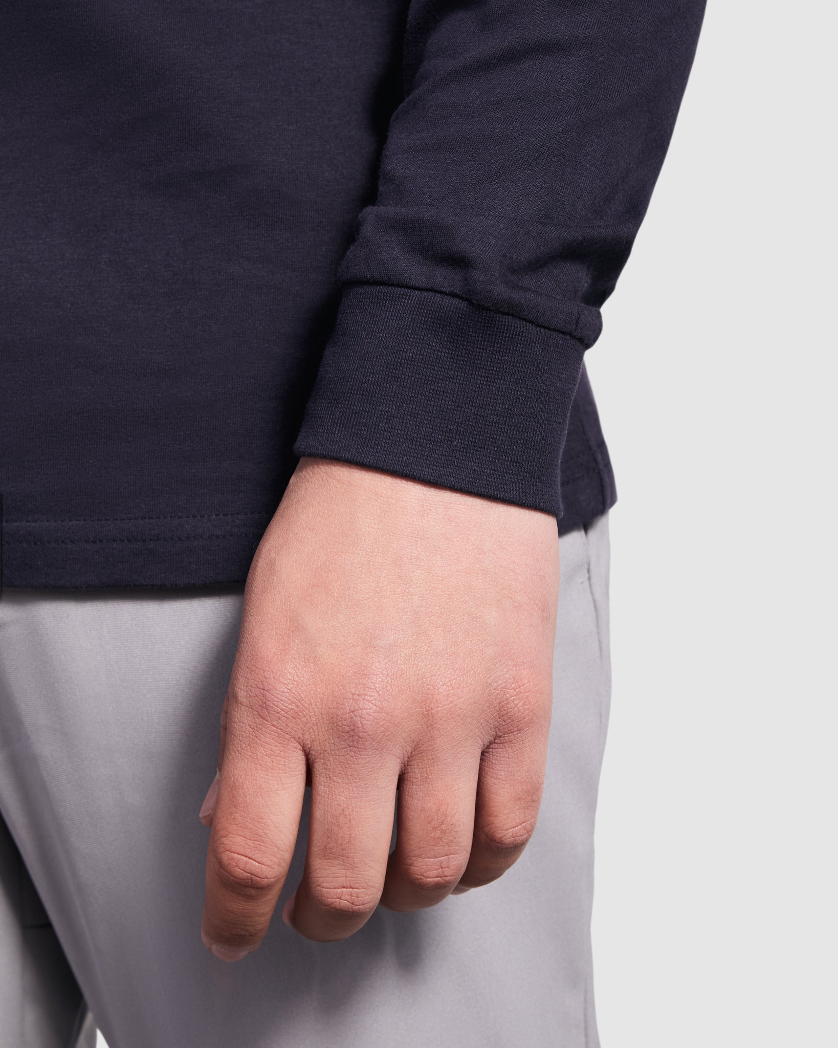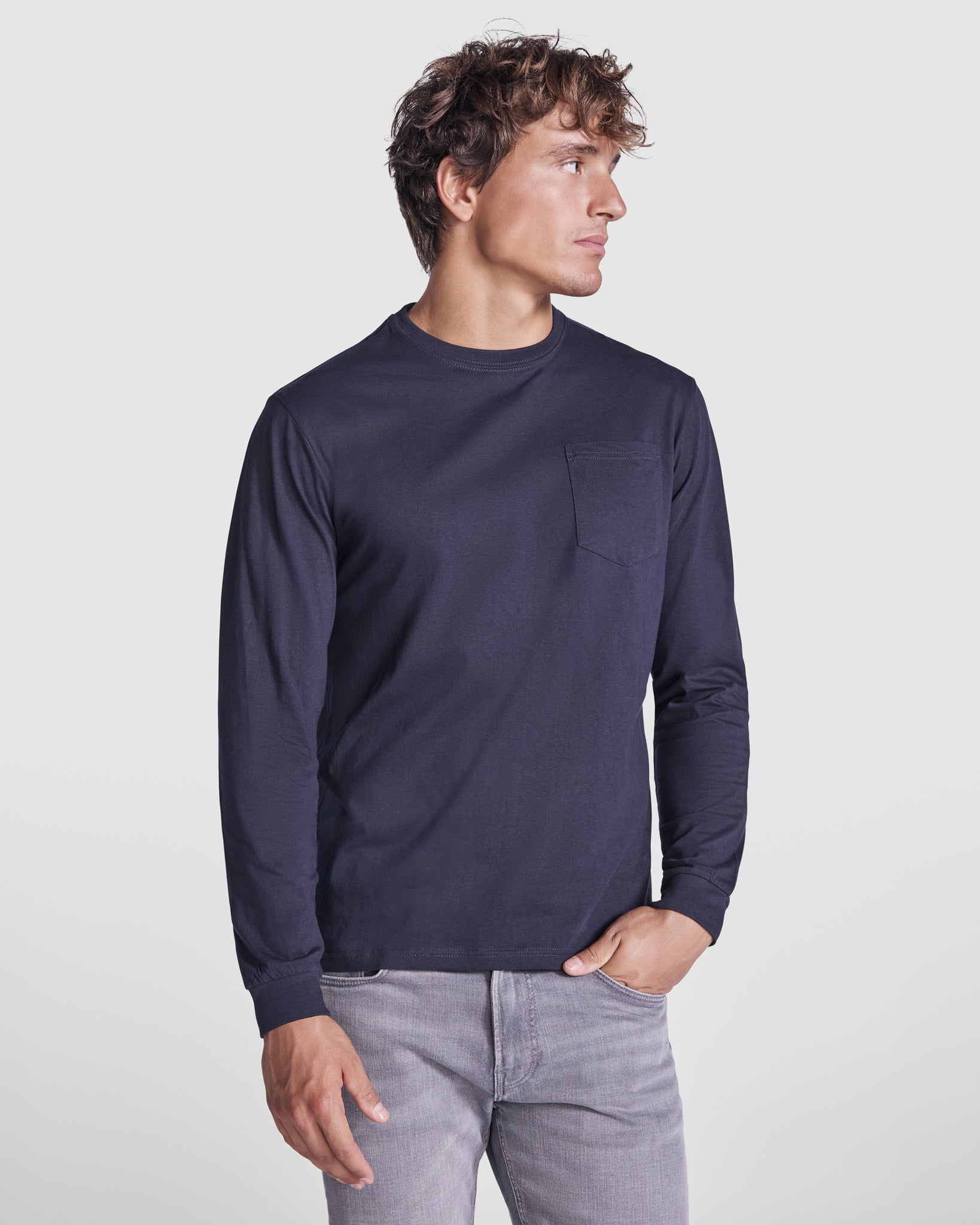 Camiseta de manga larga con costuras laterales. Cuello redondo y puños en canalé 1x1. Cubrecosturas en cuello del mismo tejido. Bolsillo en pecho izquierdo.