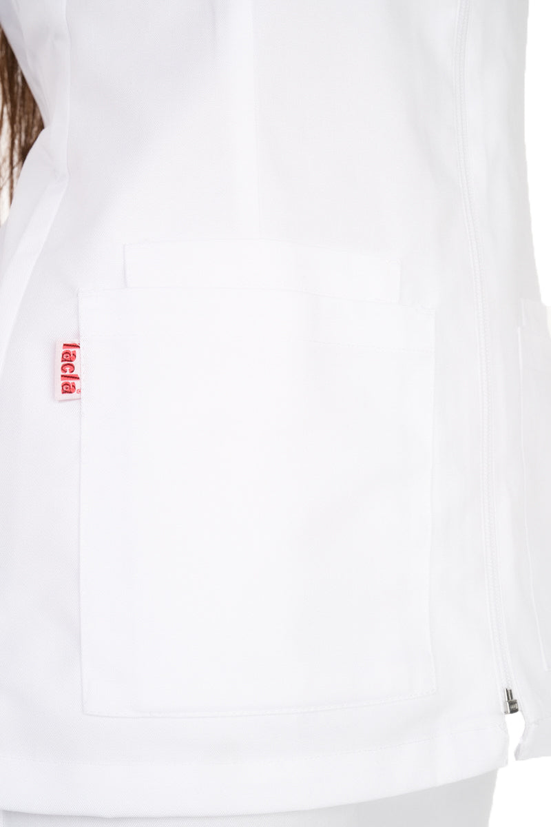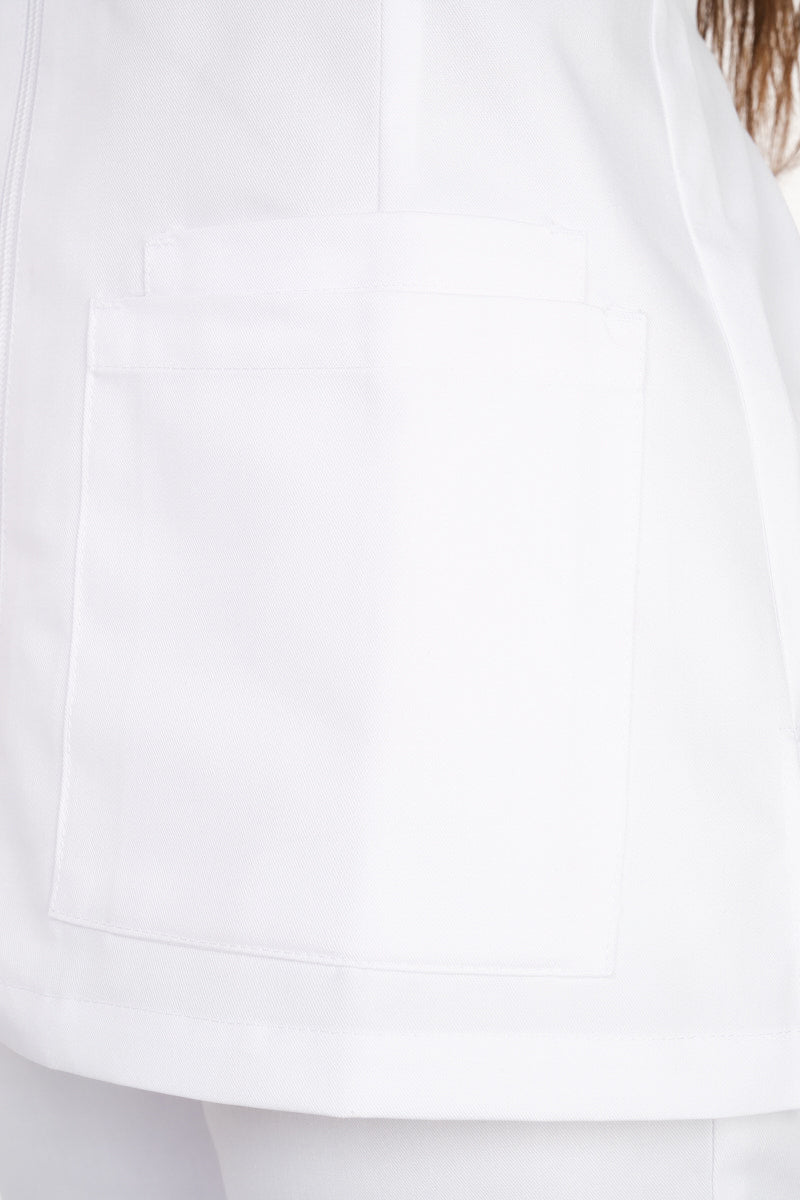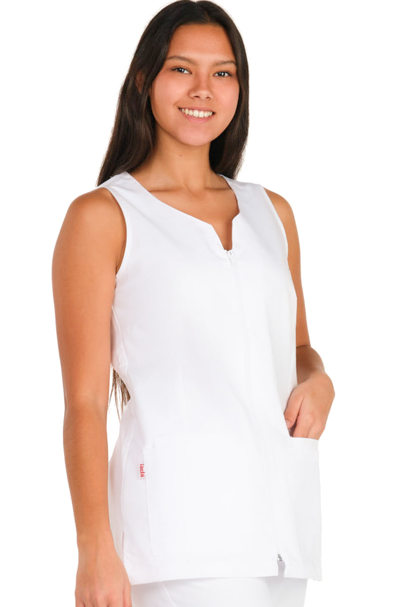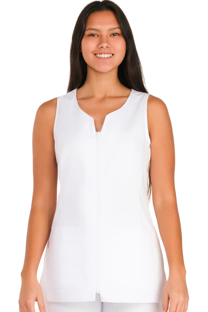 Diseño sin mangas para aportar máxima comodidad y libertad de movimiento. Escote redondeado con abertura en pico y cierre en el centro dando un look profesional impecable.