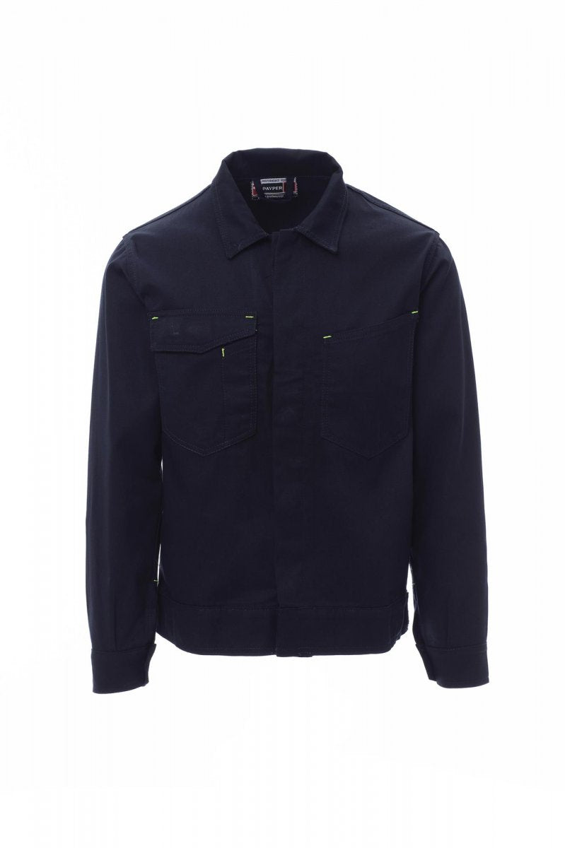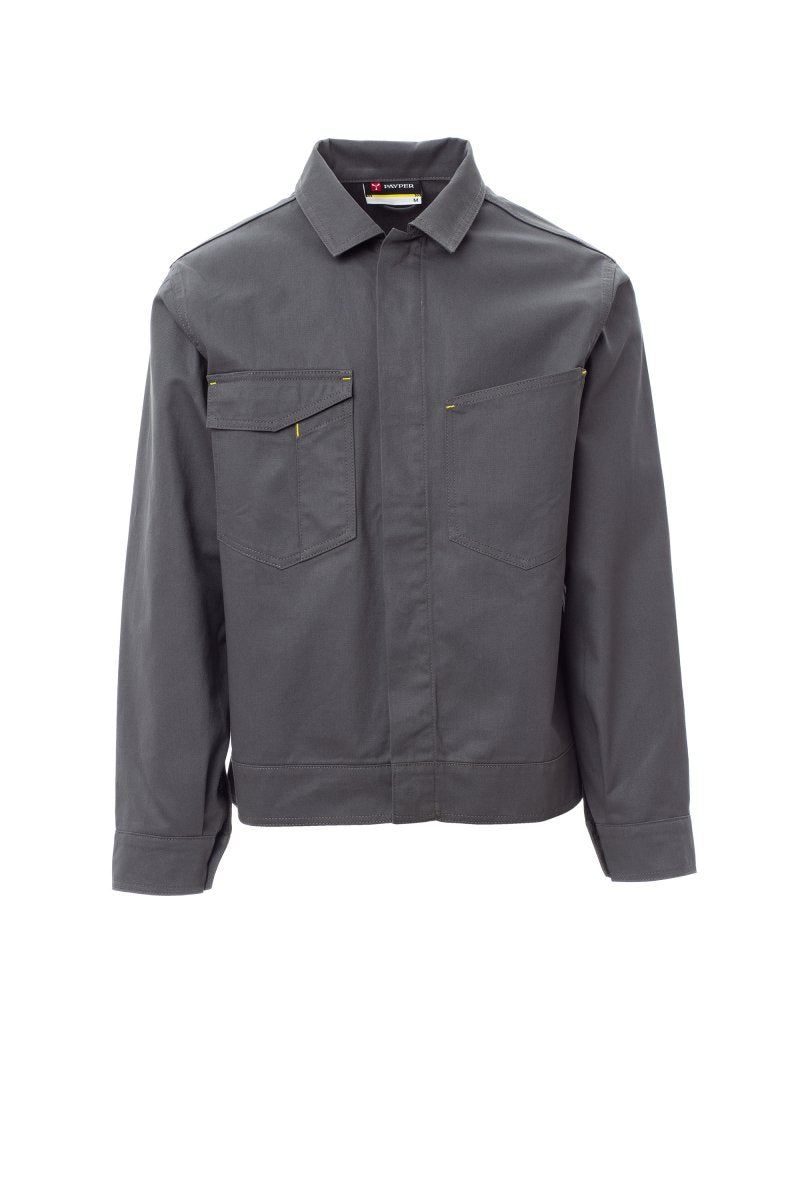 Chaqueta no acolchada de corte estilizado tipo vaquero, cierre delantero, con botones de plástico cubiertos; dos bolsillos a la altura del pecho, uno de los cuales con soporte para teléfono móvil, soporte para tarjeta de identificación, soporte para bolígrafos y tapeta de cierre con velcro. Cierre en el puño con botón y cintura ajustable con velcro. Interior sin forrar.