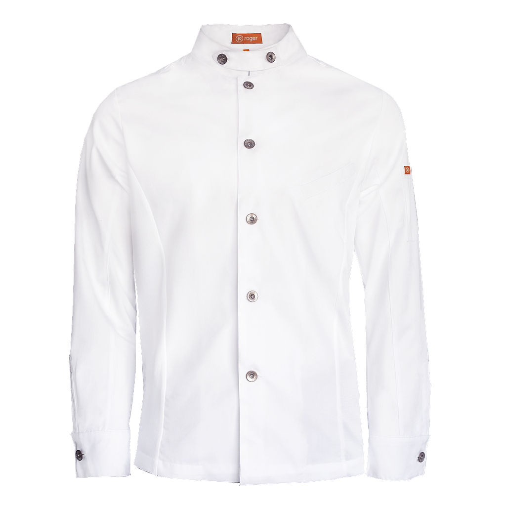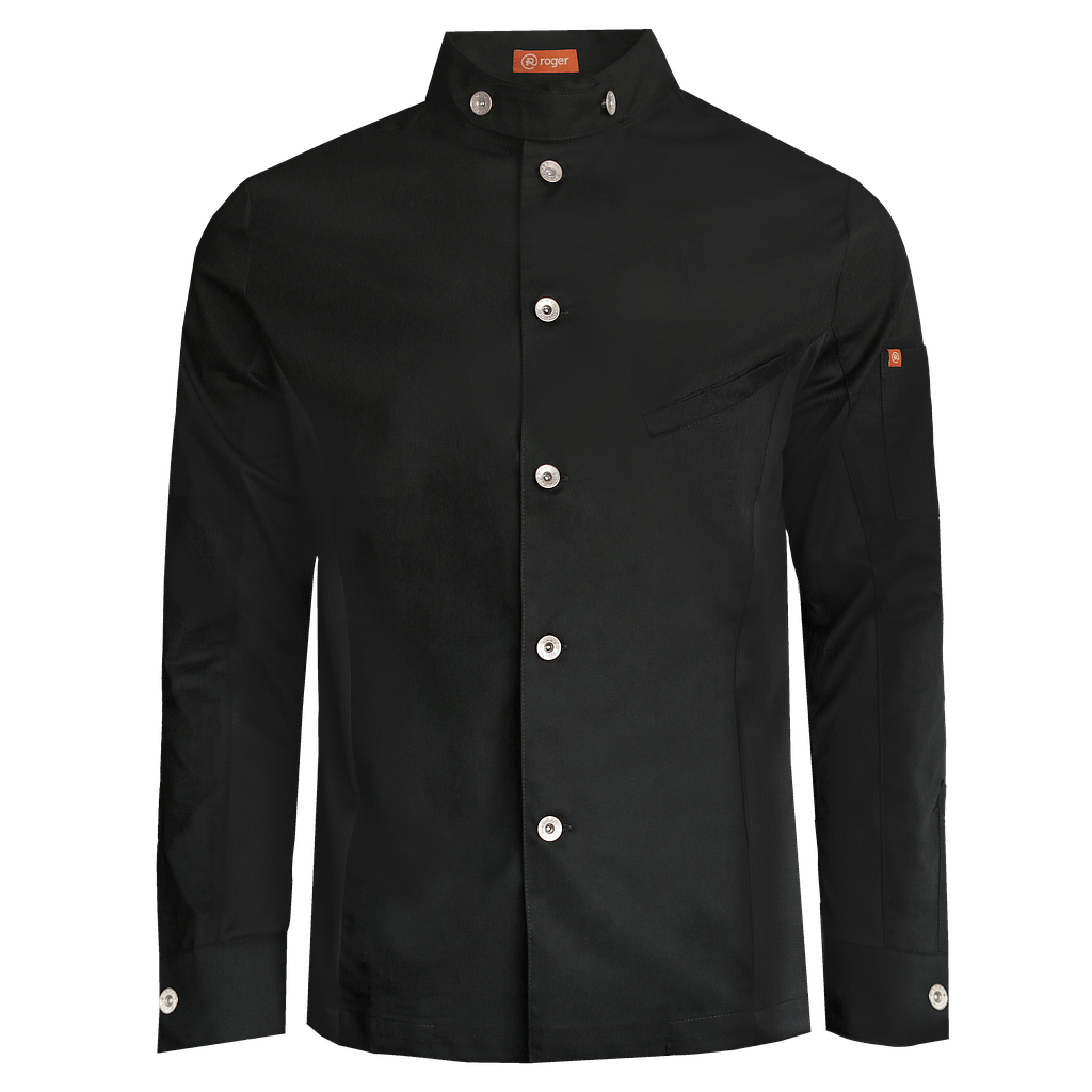 Chaqueta de cocina unisex de manga larga con cuello Mao y trabillas en hombros. Cierre con botonadura metálica y bolsillo invisible de vivo en pecho y manga izquierda. Costadillos y bajo mangas en 100% Poliéster Coolmax Transpirable para máxima comodidad y ventilación. Ideal para chefs y profesionales exigentes.
