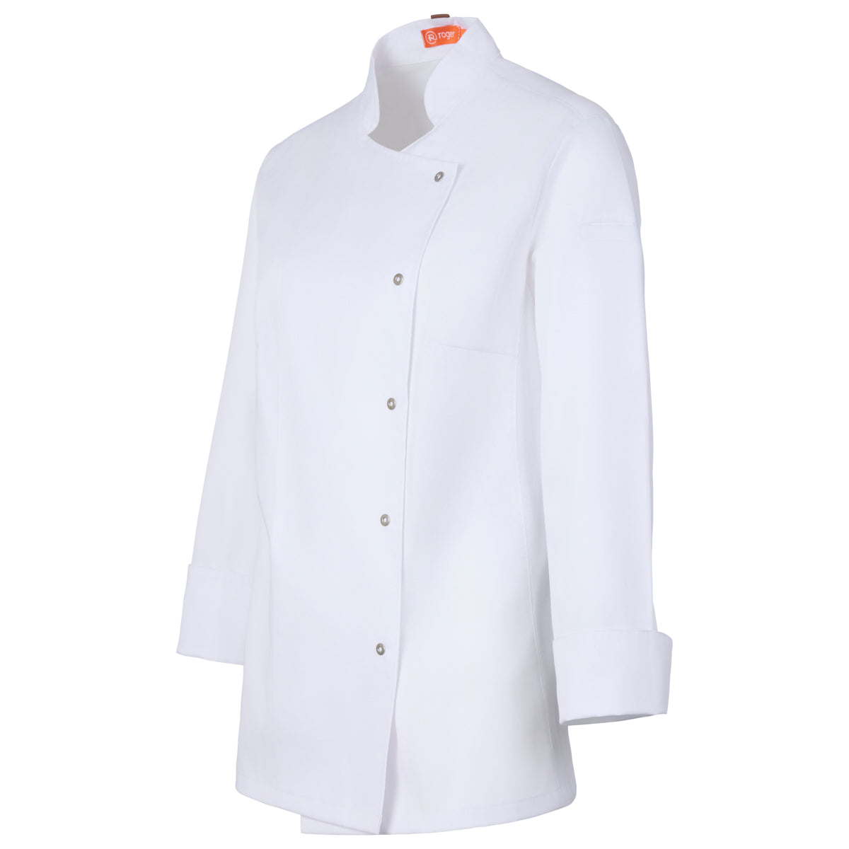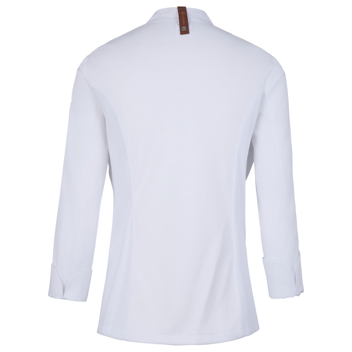 La chaqueta de cocina de manga larga para mujer ofrece un diseño elegante y funcional. Con costadillos delanteros y traseros en tejido de piqué contrastante, añade un toque de estilo. Su cierre cruzado con botones a presión asegura comodidad y practicidad. Equipada con un bolsillo de vivo en la manga izquierda para mayor conveniencia. La espalda central en 100% Poliéster Coolmax Transpirable garantiza una experiencia fresca y confortable durante largas jornadas de trabajo en la cocina.