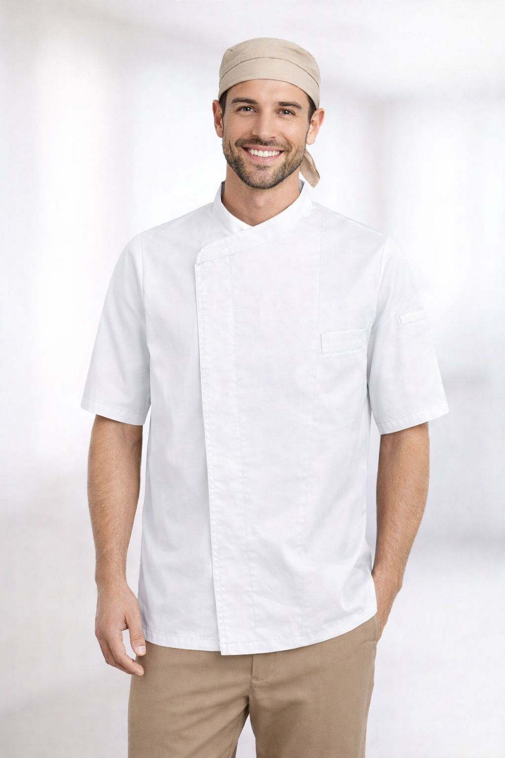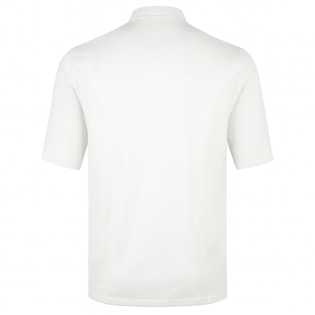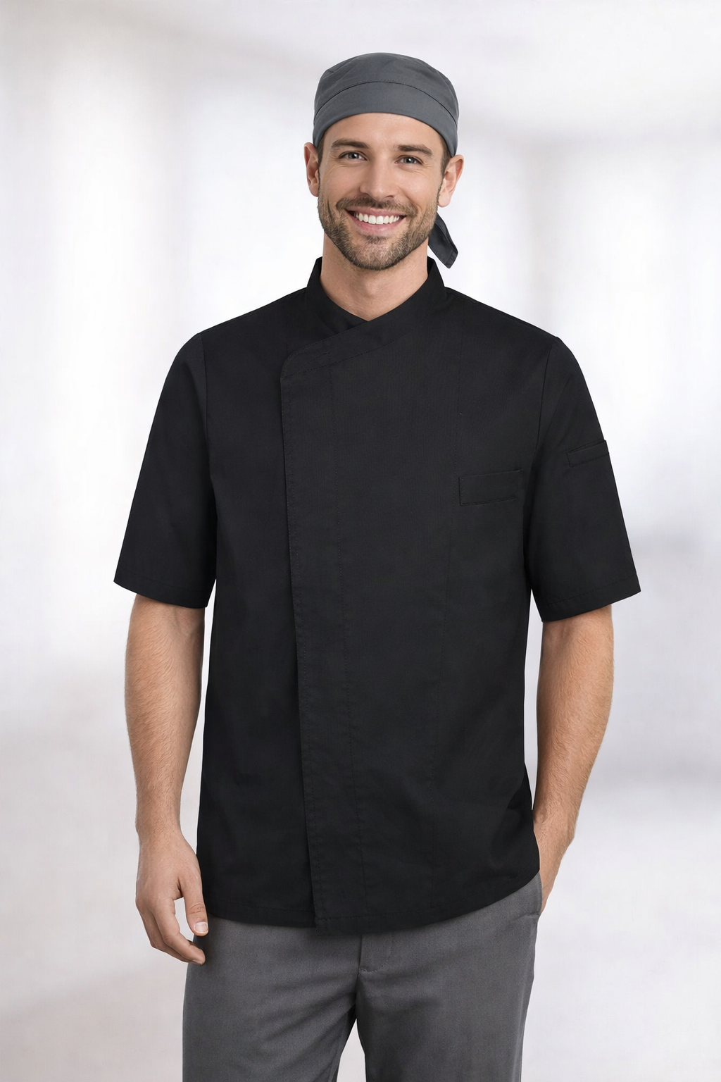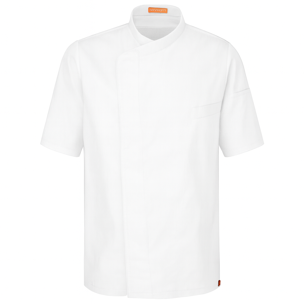 Chaqueta cocina manga corta unisex con cierre cruzado y botones automáticos ocultos. Bolsillo frontal izquierdo. Espalda en 100% Poliéster Coolmax Transpirable. Ideal para chefs que valoran confort y estilo en su uniforme.