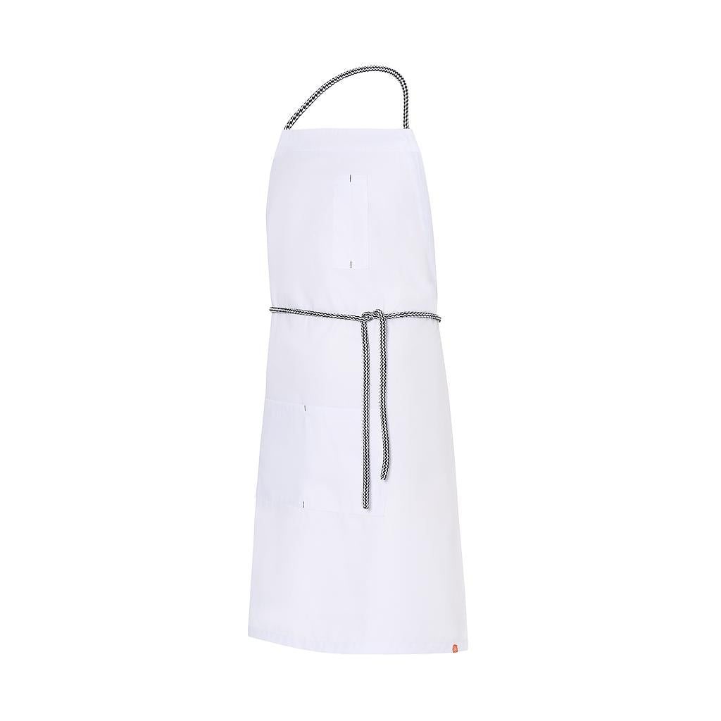 Delantal peto con ajuste al cuello mediante cinta y mosquetón, y ajuste a la cintura con cinta anudable. Destacados detalles en contraste en pecho, bolsillos y cerillera. Perfecto para profesionales exigentes que valoran la comodidad y el diseño en su indumentaria laboral.