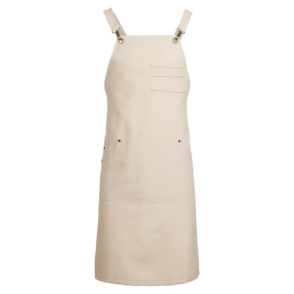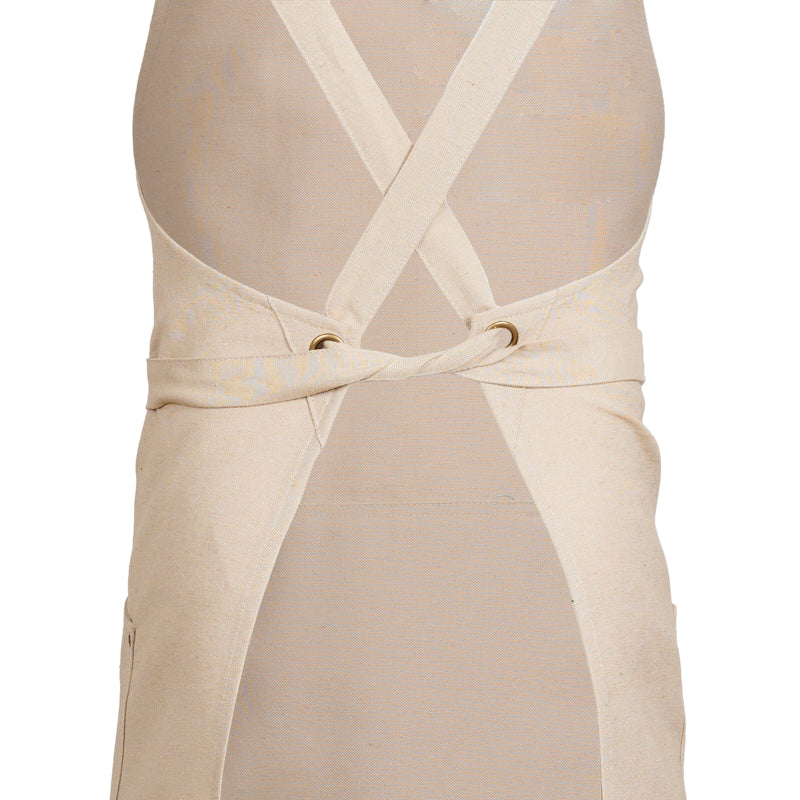 Delantal peto con ajuste al cuello mediante cinta y mosquetón, y ajuste a la cintura con cinta anudable para comodidad personalizada. Detalles en contraste en pecho, bolsillos y cerillera. Medidas: 76 x 91 cm