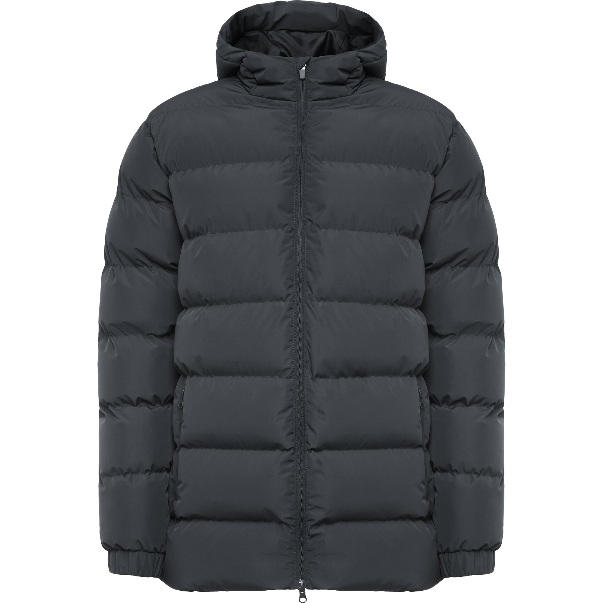 Parka acolchada repelente al agua con capucha fija y visera. Cremallera frontal al tono y tirador de doble dirección. Protector de barbilla del mismo tejido. Puños elásticos. Bolsillos laterales con cremalleras al tono. Bolsillo interior en pecho izquierdo. Acceso interior para reprocesos.