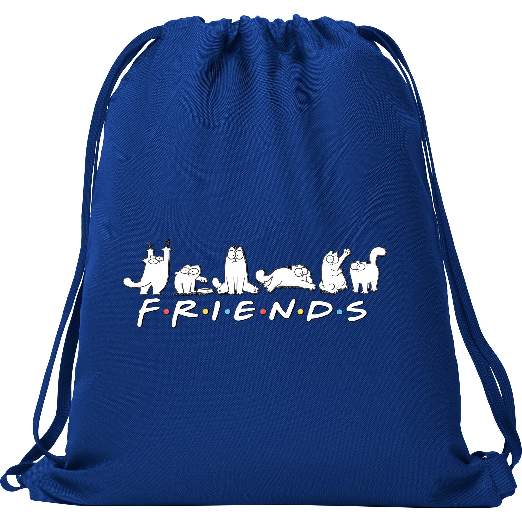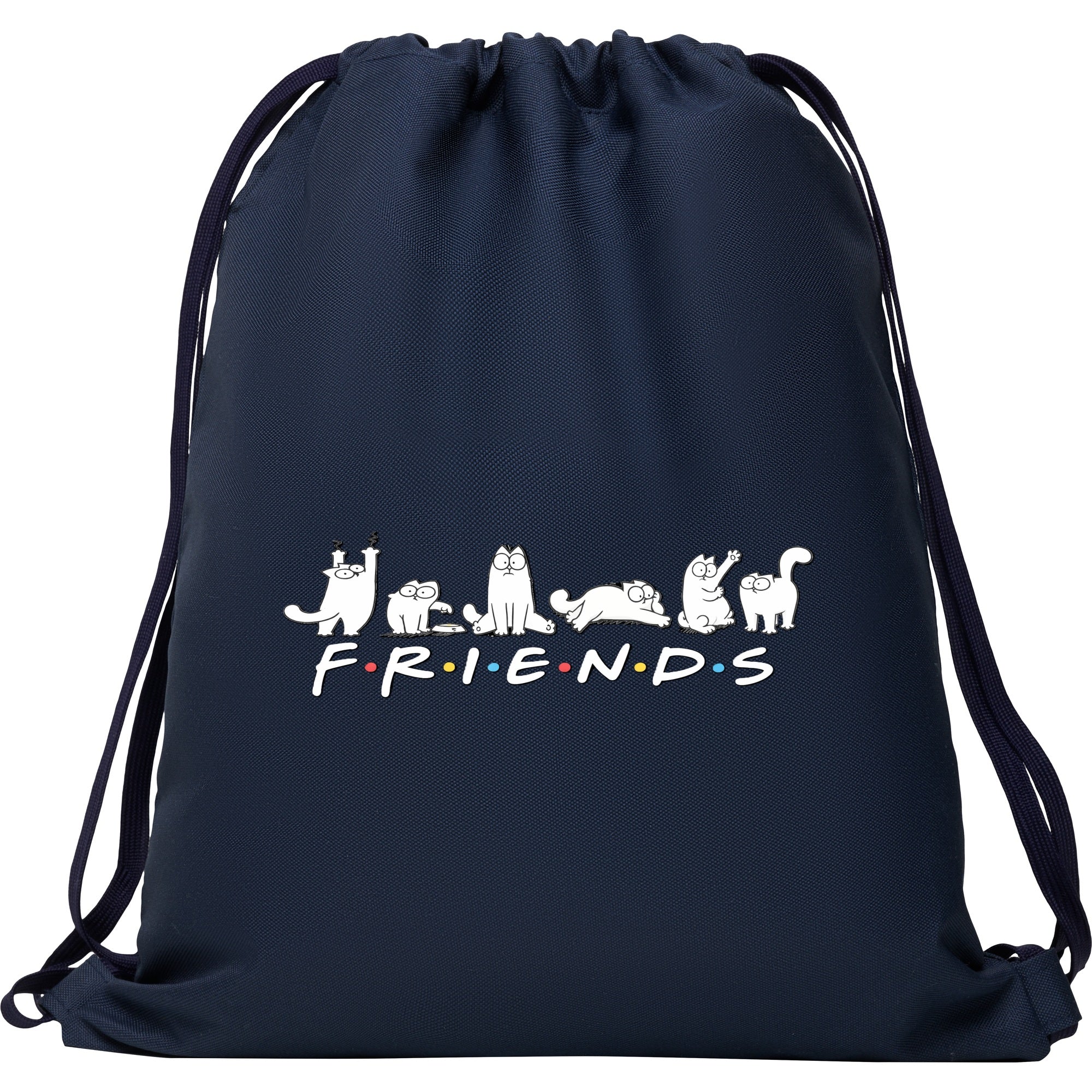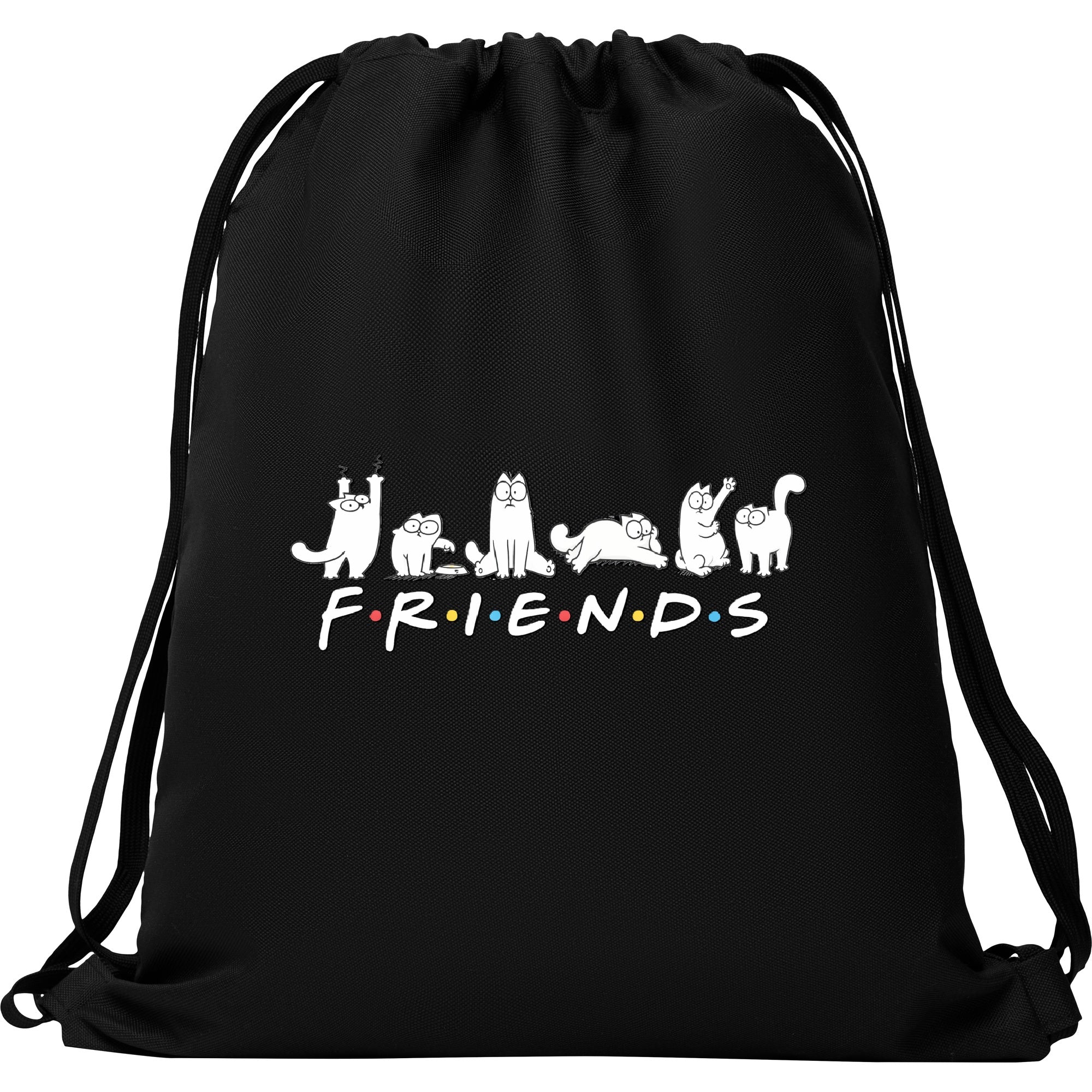 Mochila deportiva de diseño plano. Cordones planos a tono. Bolsillo interior con cremallera. 100% poliéster 600D. 150 g/m². Estampado DTF Friends.