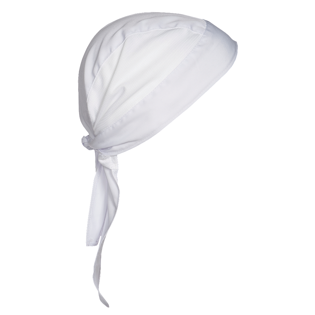 Bandana de cocina con franja central confeccionada en 100% poliéster Coolmax transpirable, diseñada para mantener la frescura durante largas jornadas. Su cierre con lazada en la nuca asegura un ajuste cómodo y seguro, ideal para ambientes de cocina profesional.