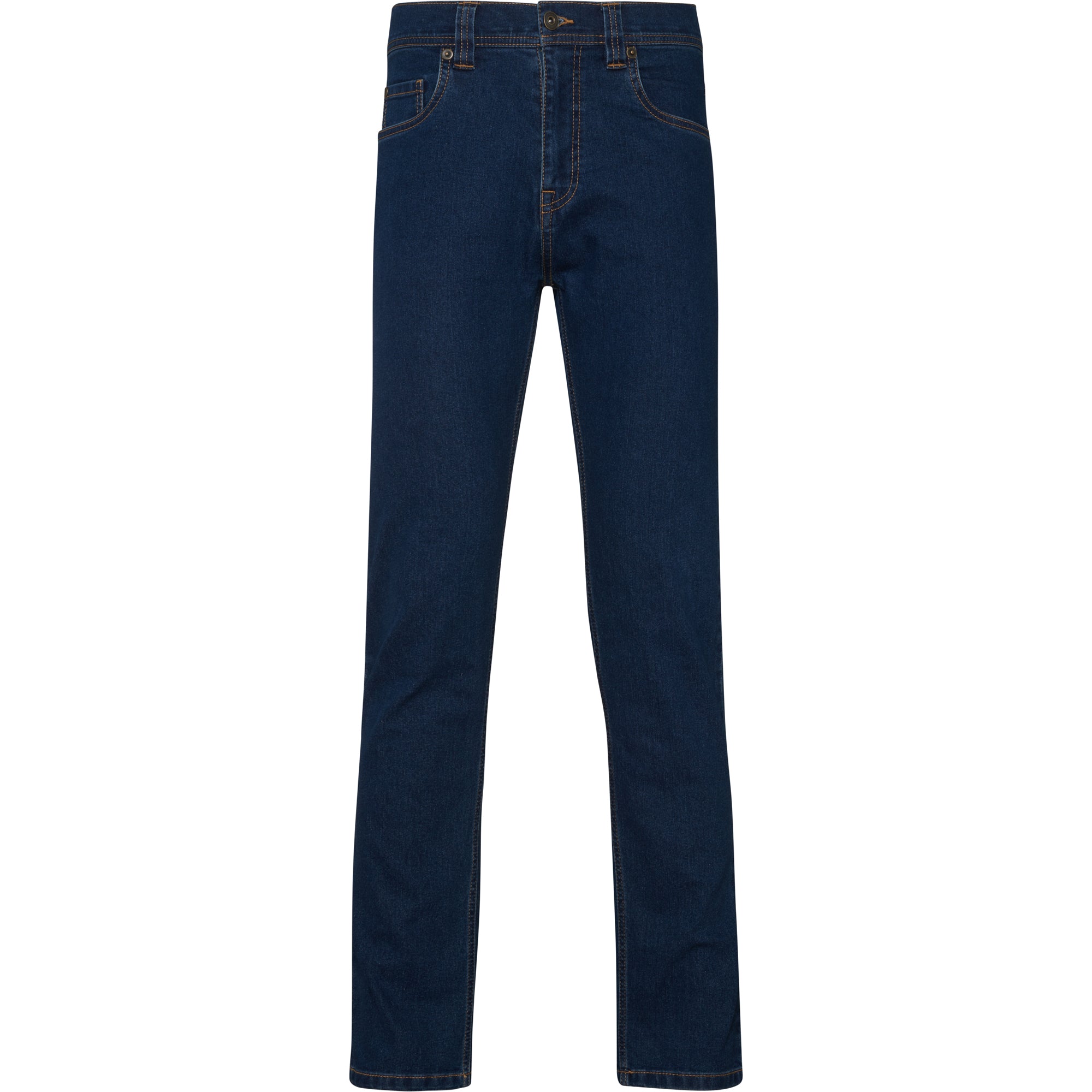 Pantalón vaquero de hombre. De corte regular fit y tiro medio. Cinturilla con 5 trabillas. Bragueta con cremallera metálica. Dos bolsillos frontales y bolsillo portamonedas. Dos bolsillos traseros. Corte semientallado en tejido elástico.