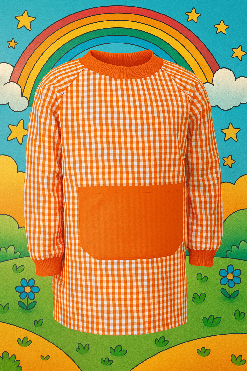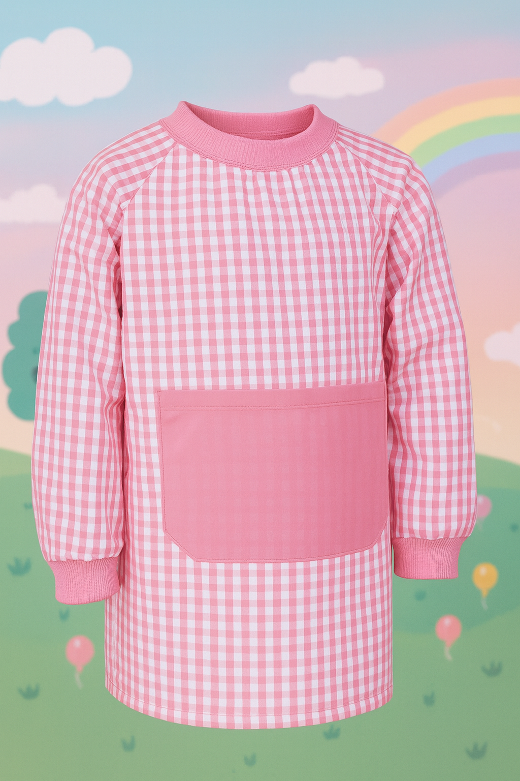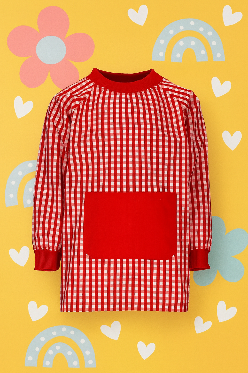 - Bata infantil con cuello redondo, sin botones y amplio bolsillo central.