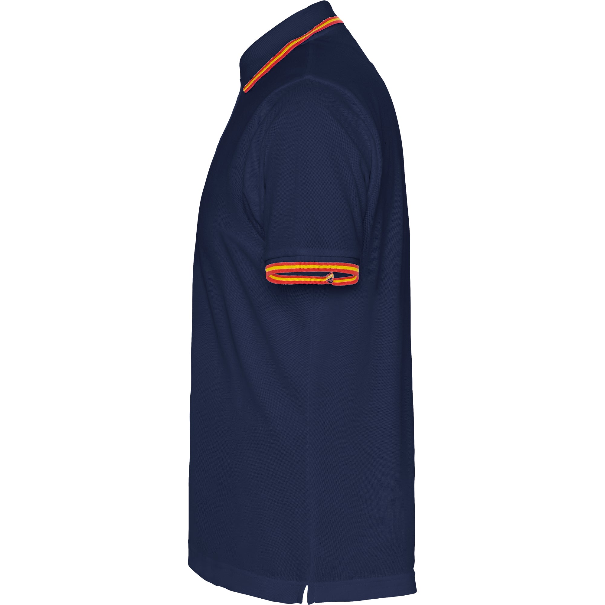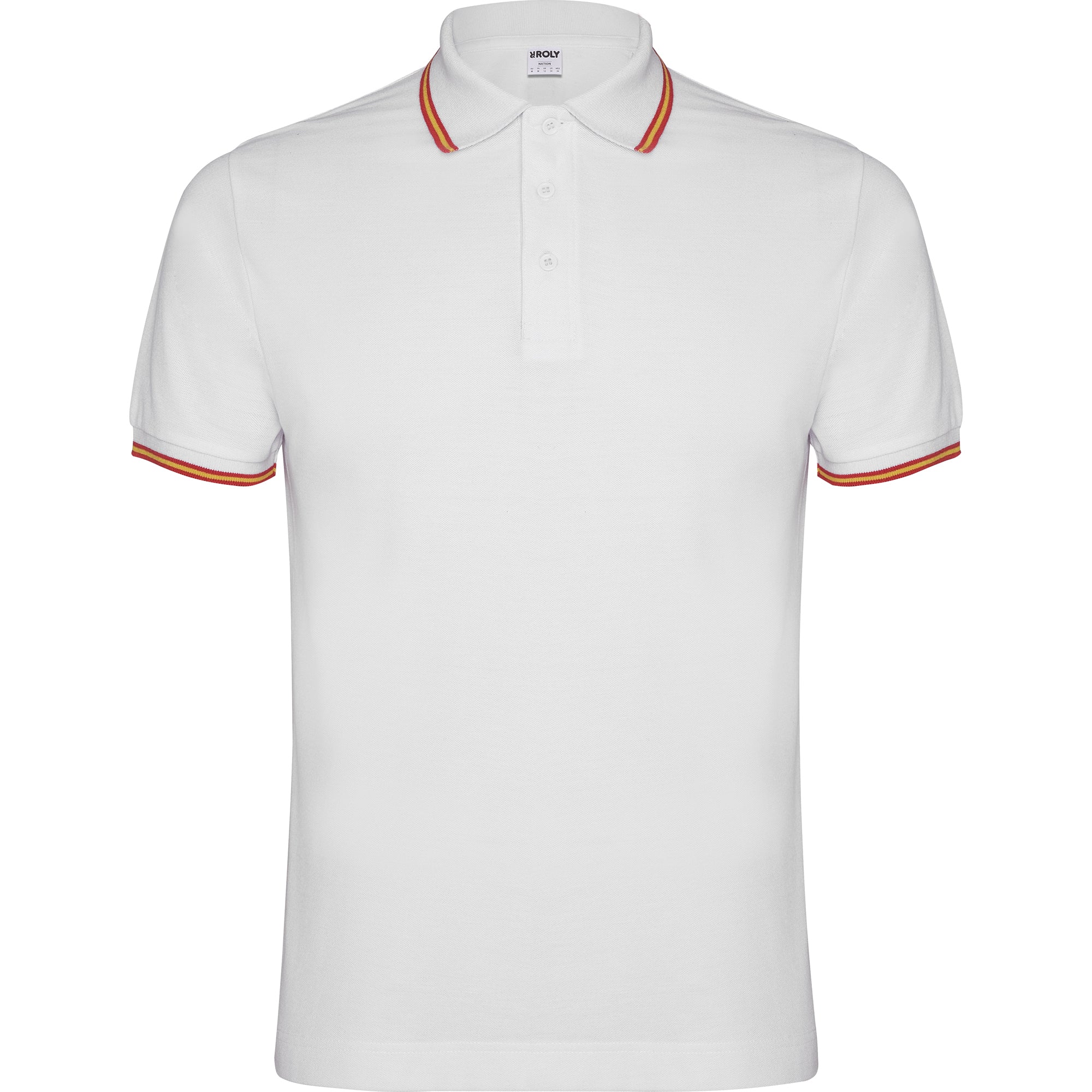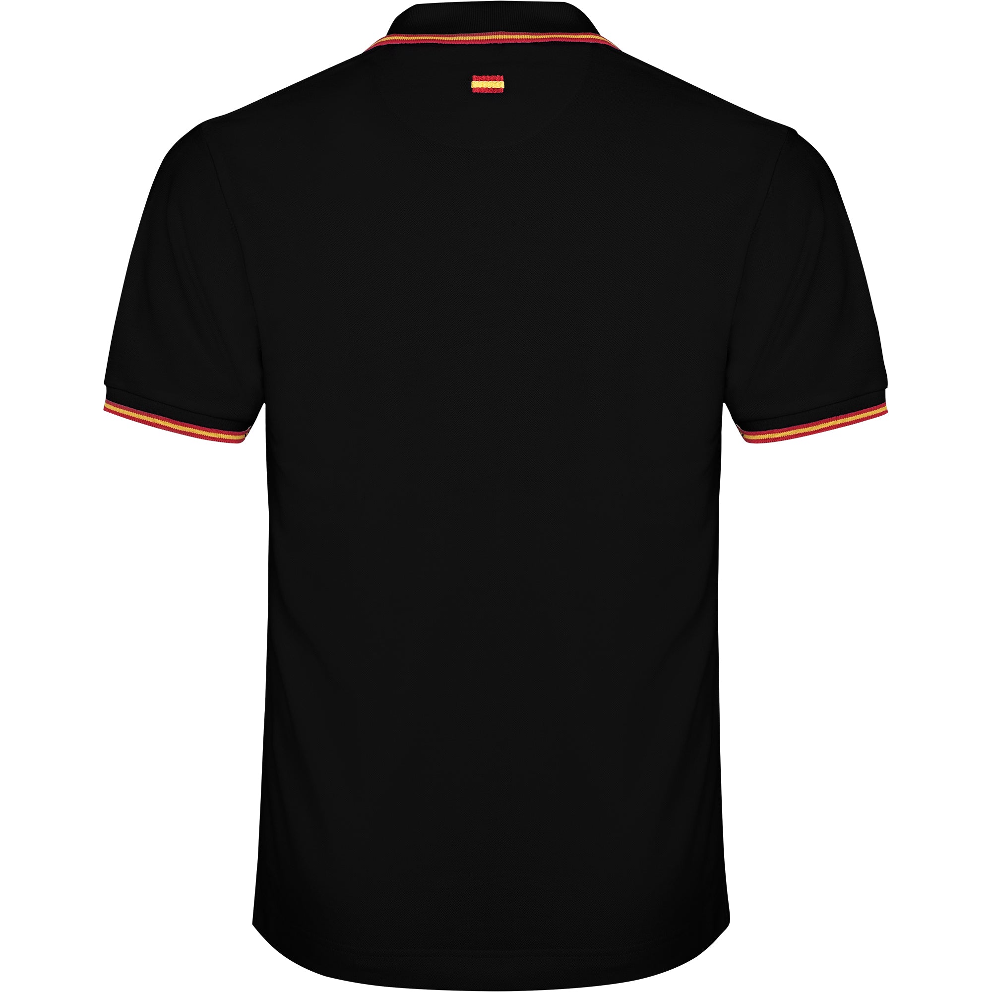 Polo manga corta, cuello y bocamangas jackard con tapeta de tres botones. Cubre costuras reforzado en cuello. Adorno de bandera bordado en la espalda.
