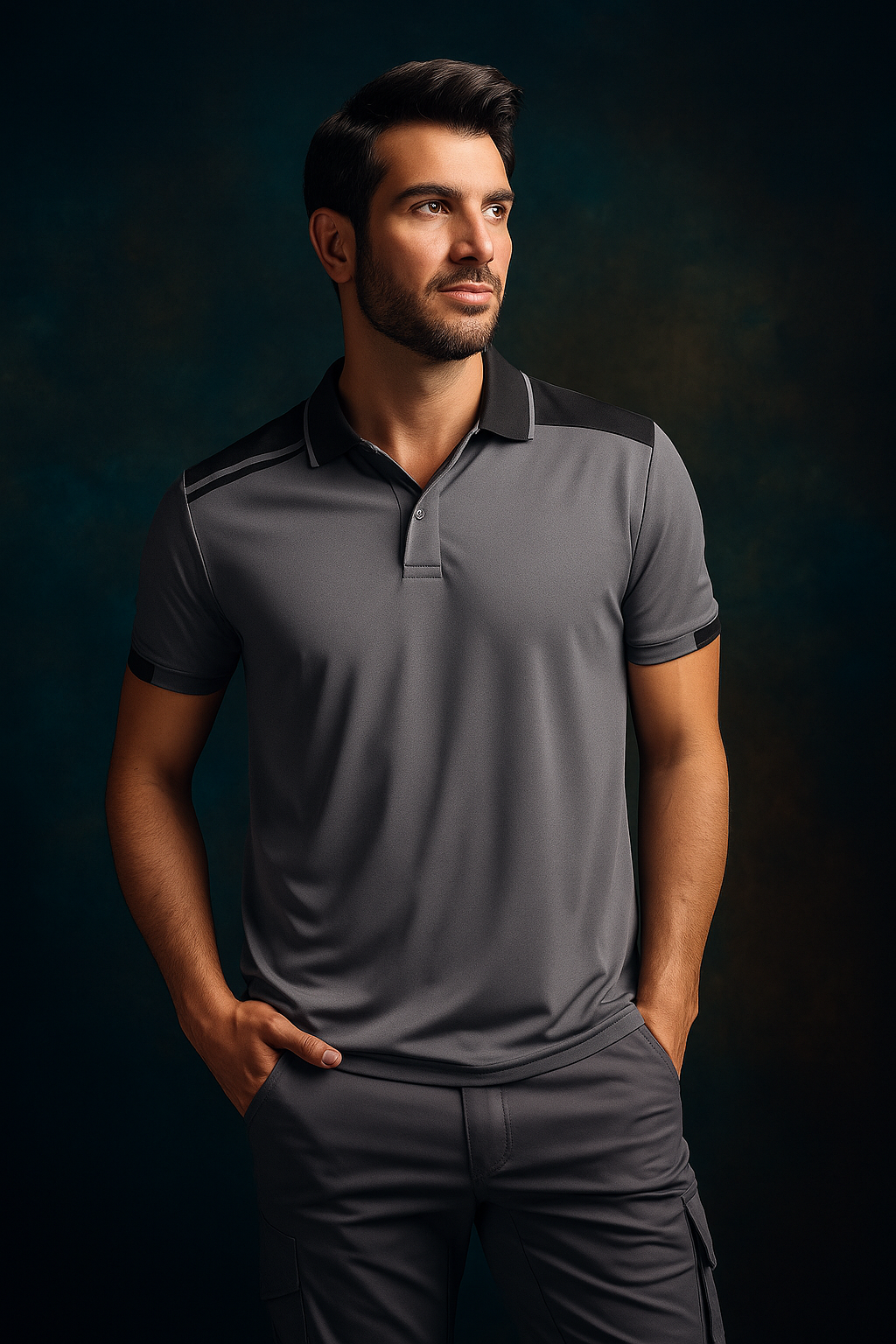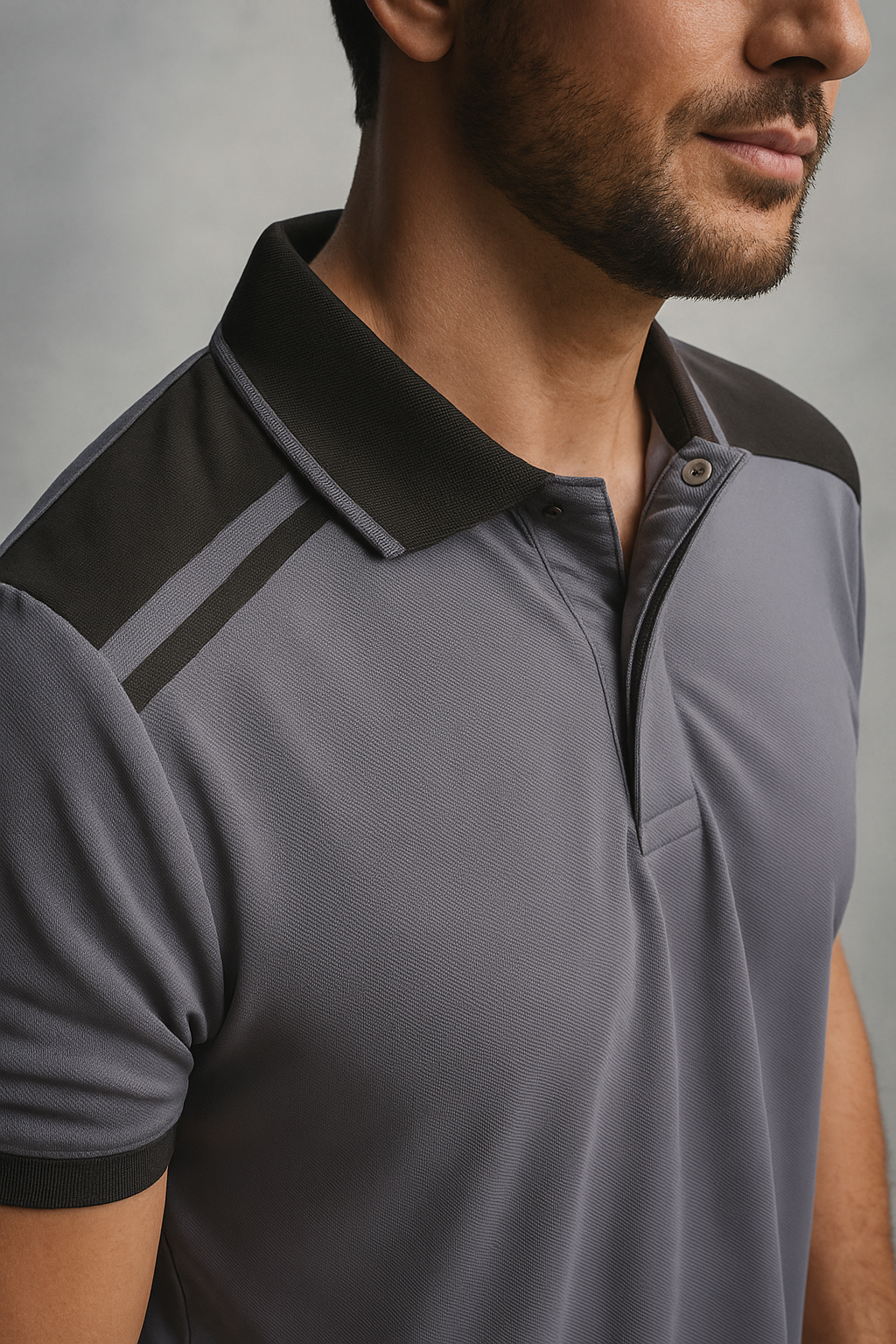 Polo de manga corta con colores combinados. · Cuello y mitad de la manga en ribete de canalé 1x1. · Cubre costuras reforzado en cuello. · Piezas de hombros y detalles a contraste. · Tapeta con 2 botones. · Aperturas laterales en el bajo. · Bolsillo opcional.