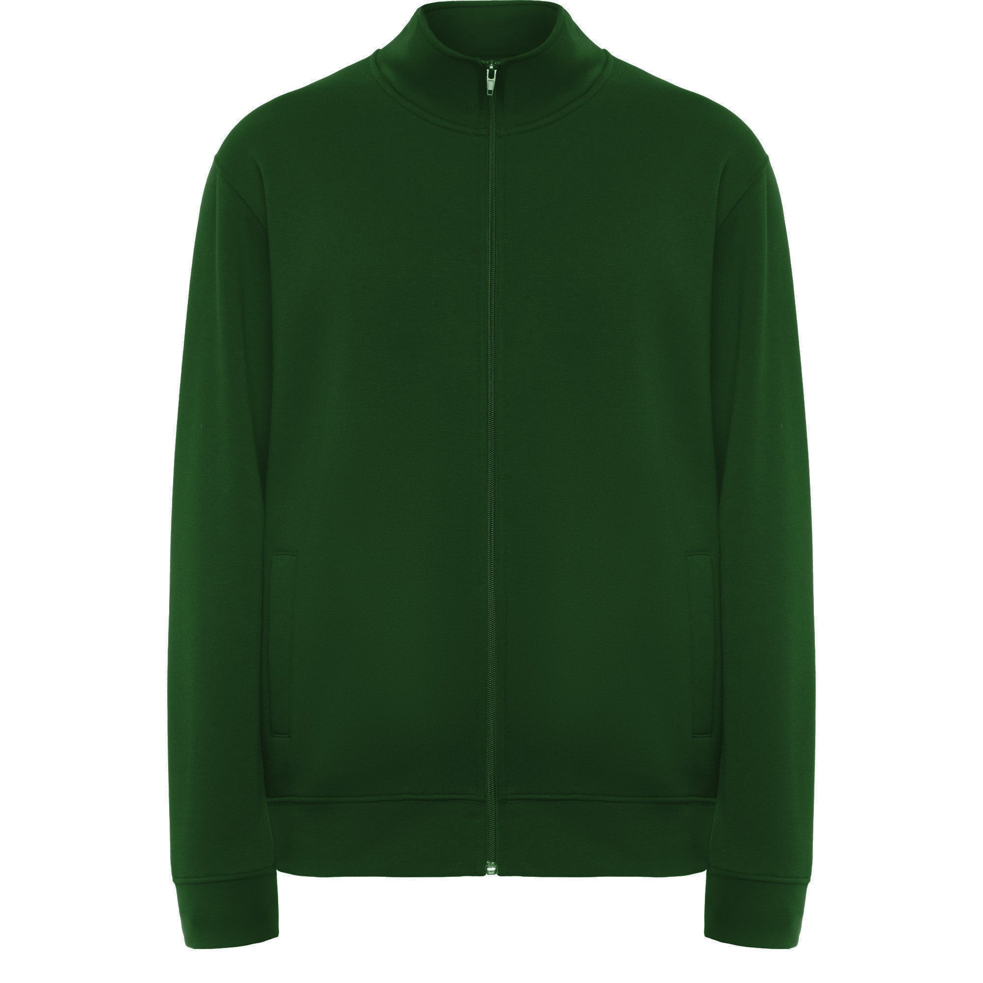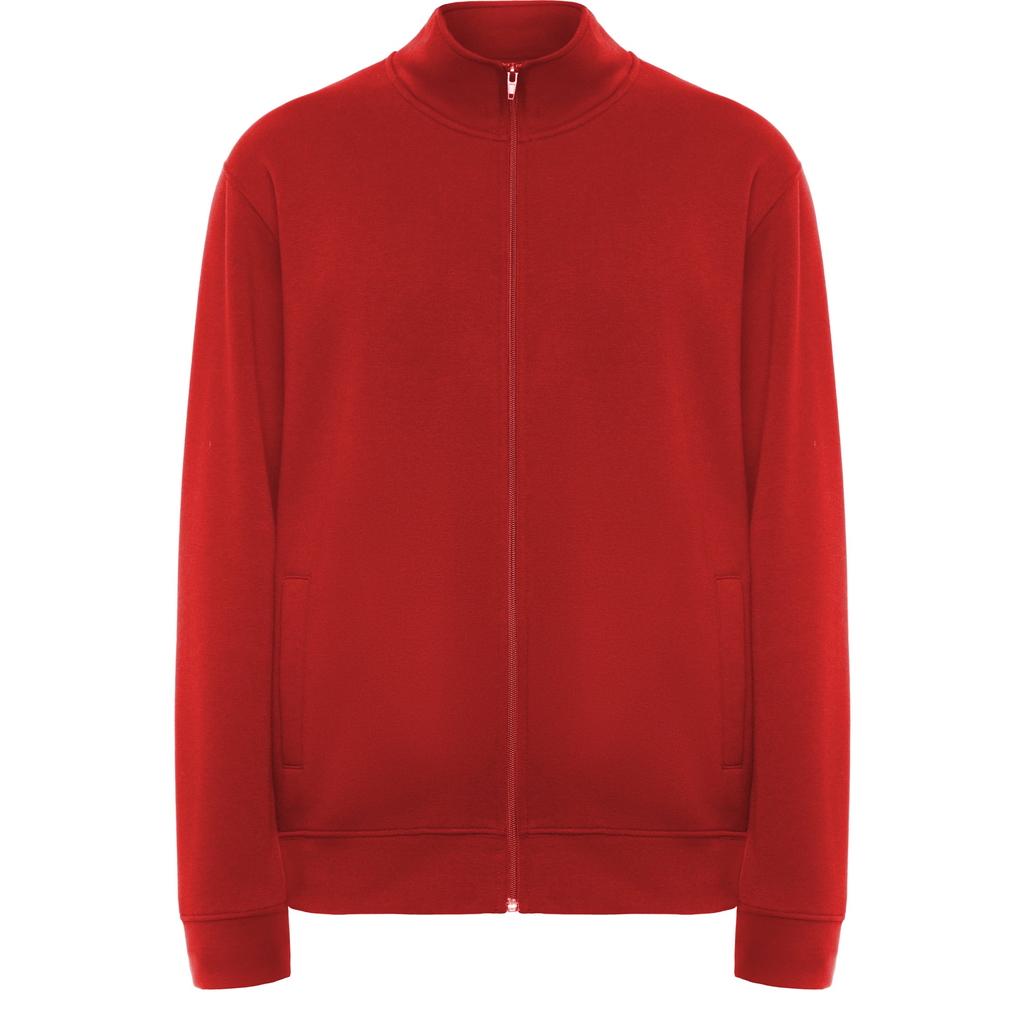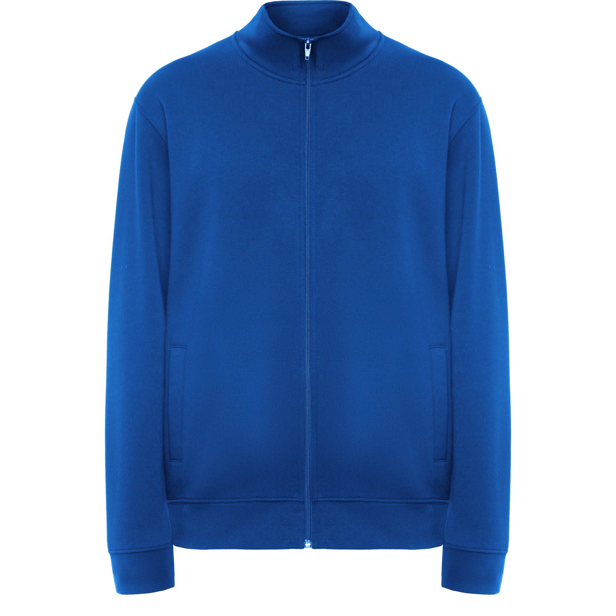 Sudadera unisex con cremallera frontal y cuello alto. Cremallera al tono. Dos bolsillos laterales con ribete del mismo tejido. Puños y cinturilla en canalé 2x1 con elastano. Cubrecosturas del mismo tejido.