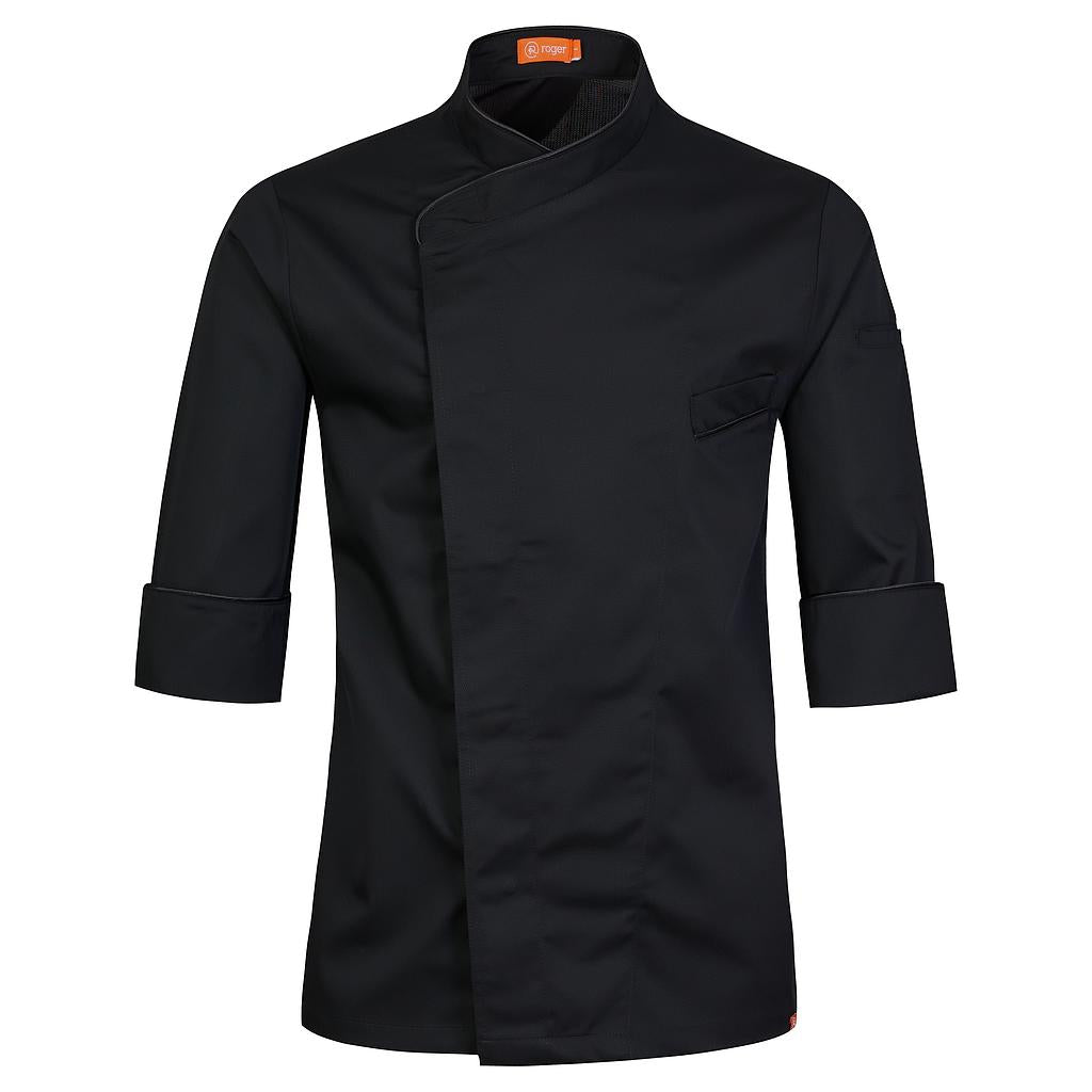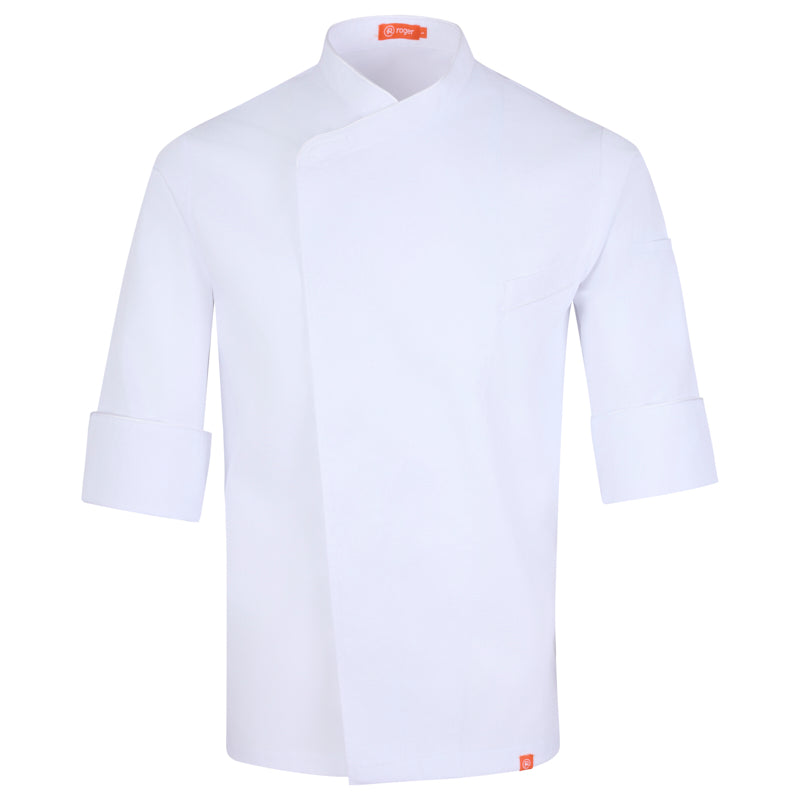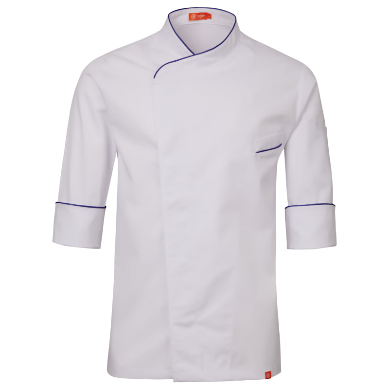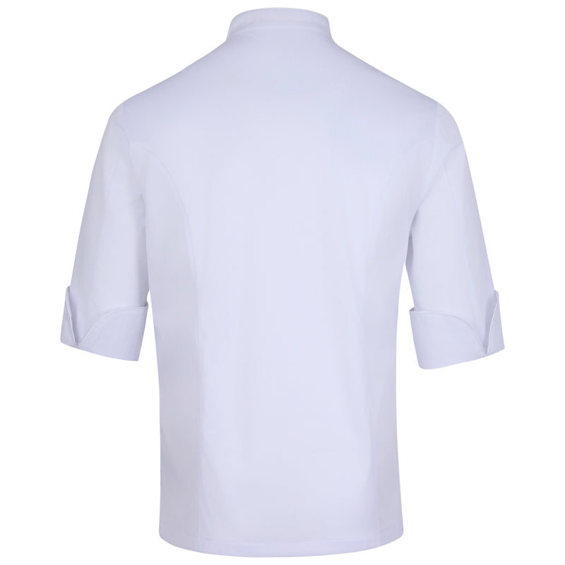 La chaqueta de cocina para hombre de manga 3/4 presenta un diseño elegante con vivos a contraste en cuello, bolsillo frontal, puños y solapa. Equipada con bolsillos en el frontal izquierdo y en la manga izquierda para mayor conveniencia. Su cierre cruzado con botones automáticos ocultos garantiza un ajuste seguro. Además, su espalda en 100% Poliéster Coolmax Transpirable ofrece comodidad durante largas jornadas en la cocina.